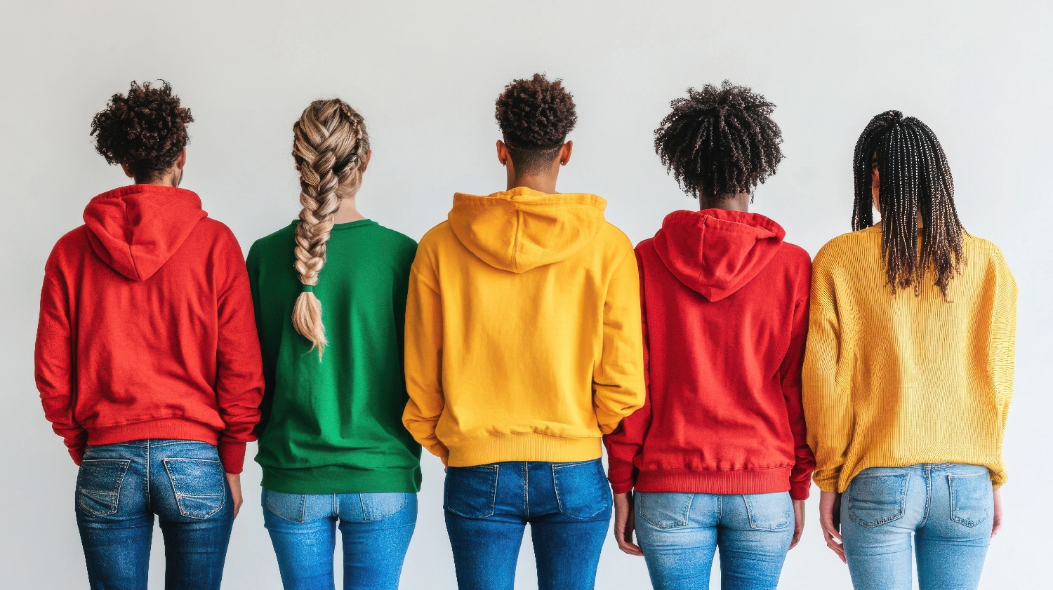 A group of eight individuals stands side by side, showcasing their unique styles in brightly colored hoodies. They appear to enjoy each other’s company in a casual atmosphere.